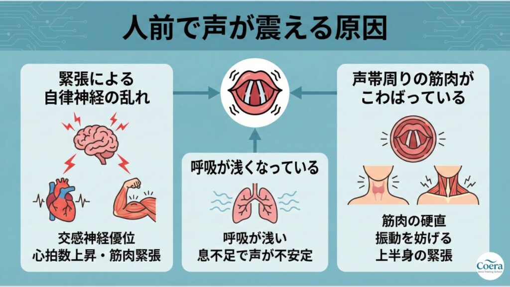 声が震える原因は、緊張による自律神経の乱れや呼吸の浅さ、筋肉のこわばりにあります。