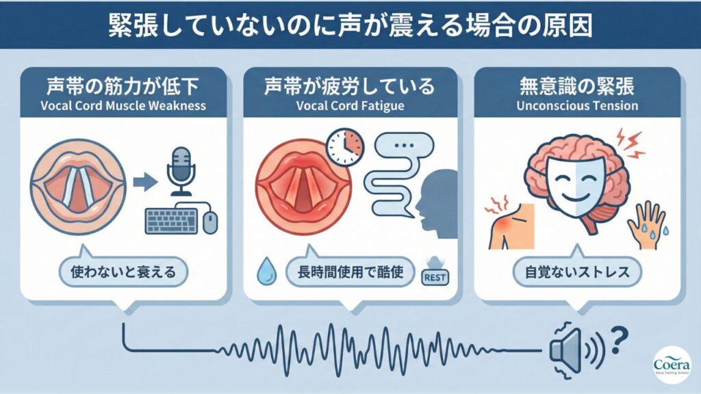 緊張していなくても声が震える場合、声帯の筋力低下が原因かもしれません。