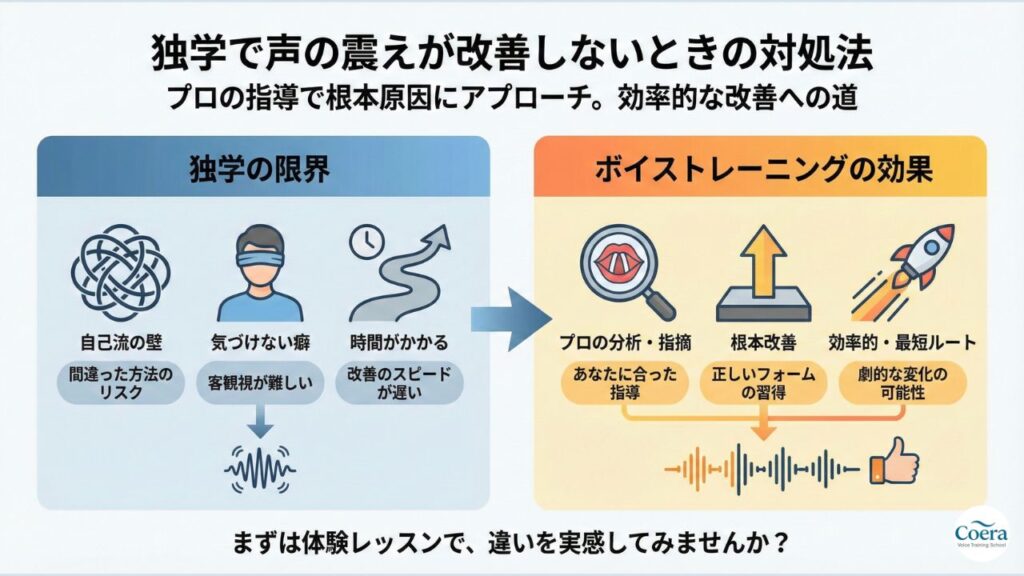 声の震えを独学で改善しようとすると、壁にぶつかることがあります。