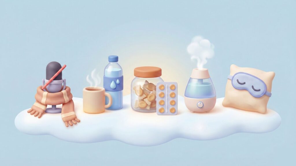 こまめな水分補給や加湿、十分な睡眠も回復を早める効果があります。
