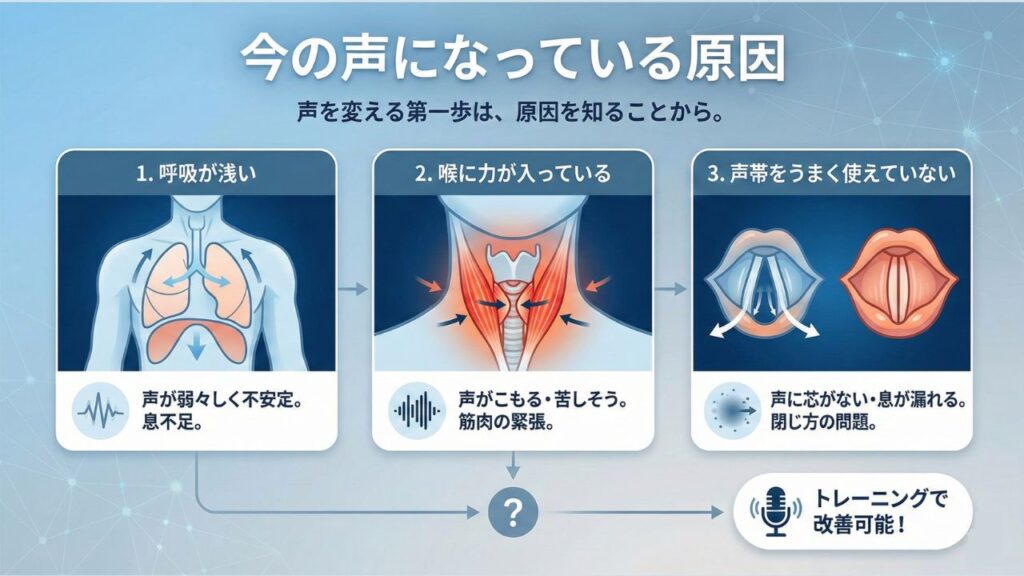声を変えるためには、まず今の声になっている原因を知ることが重要です。 多くの場合、以下の3つに問題があります。