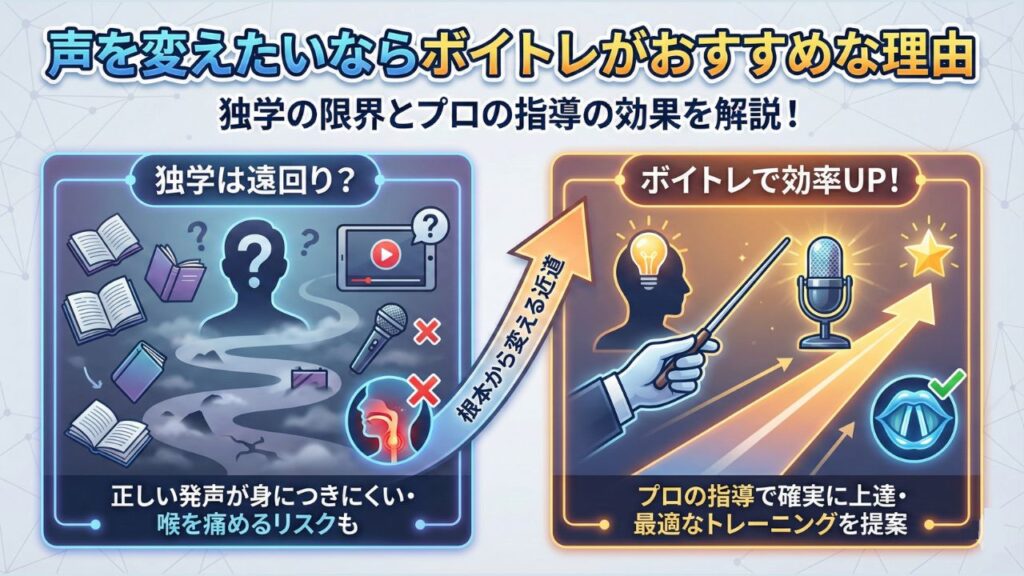 声を変えるためのトレーニングは、独学では正しい方法が身につきにくいです。